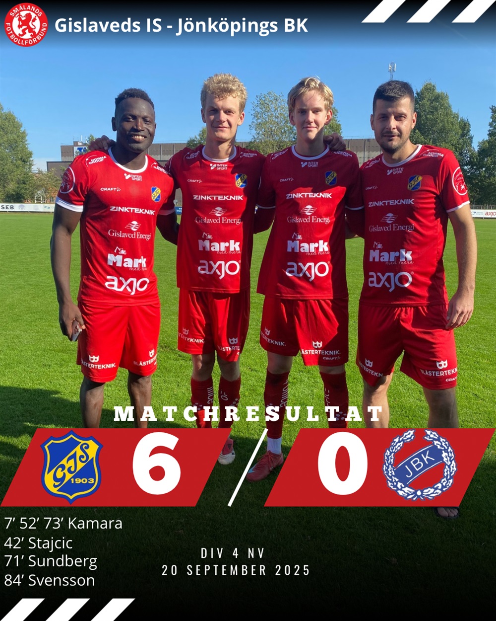 GIS-Jönköping BK 6-0 (2-0) Crespo 3mål-August 1mål-Isac 1mål-Zeljko 1mål.