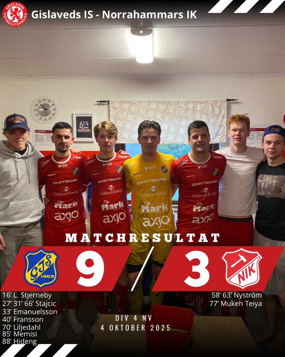 Sista omgång i Division fyra fotbollen 2025. Ruggigt väder med blåst och regn men det hindrade inte GIS från att prestera. 9-3 till hemmalaget och hela sju målskyttar i GIS-laget varav Zeljko Stajcic svarade för tre mål på egen hand. Övriga sex målskyttar gjorde var sitt mål. GIS visade direkt att laget ville avsluta serien snyggt även i omgång 22, trots att seriesegern redan spelades hem i Smålandsstenar förra lördagen då Guldhattarna plockades fram efter slutsignalen.
